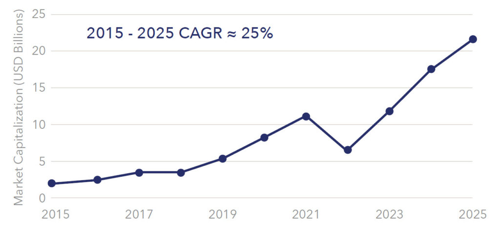 Selected Tech / Compute market capitalization represents the combined market value of leading global technology and compute platform companies, including hyperscale cloud providers and AI infrastructure leaders. The basket includes Apple, Microsoft, Alphabet, Amazon, NVIDIA, Meta Platforms, and Broadcom. Market capitalization figures are based on year-end values sourced from publicly available financial data.