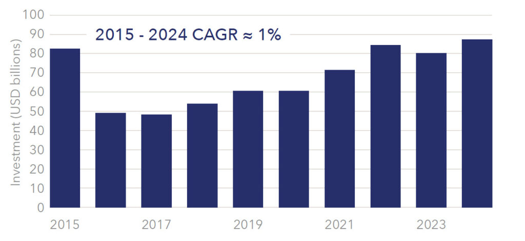 Mining investment has failed to respond accordingly. Following the commodity downturn of 2011–2015, global exploration and development spending declined sharply and has not recovered to levels consistent with projected demand growth. The consequences are structural and persistent. Developing new mineral supply typically requires 10–20 years from discovery to commercial production. As a result, today’s capital allocation decisions determine material availability well into the 2030s and 2040s.