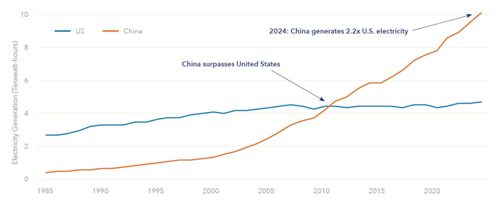 These requirements are additive. Grid infrastructure must expand not only to meet new demand, but to maintain reliability under higher utilization and greater variability. These dynamics are not occurring uniformly across economies; China’s electricity system has expanded at a scale unmatched by any other major industrial power.
